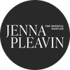 A women's life coach, Jenna Pleavin, with blonde hair, wearing a black top and blue jeans, sitting on a bed, working on a silver laptop.